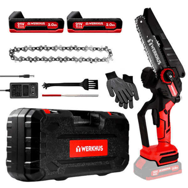 Die Kettensäge wird mit nicht einem, sondern gleich ZWEI wiederaufladbaren 2000-mAh-Akkus geliefert, die stundenlangen Dauerbetrieb ermöglichen. Keine Kabel oder Drähte – Sie können diese Säge überallhin mitnehmen, wo Sie sie brauchen.